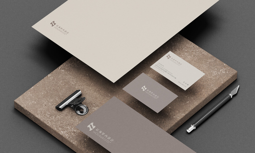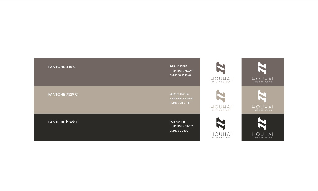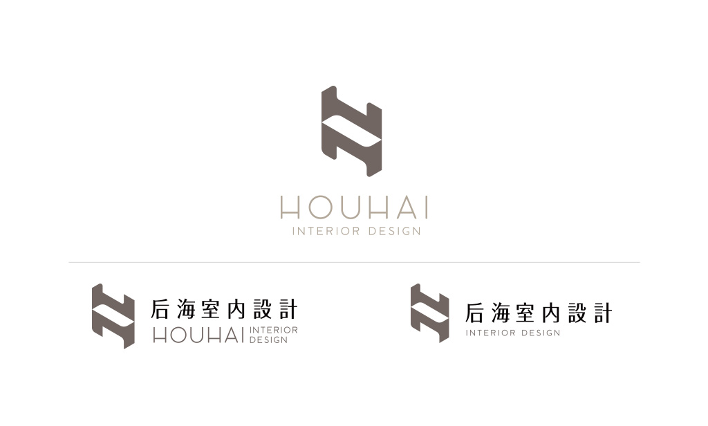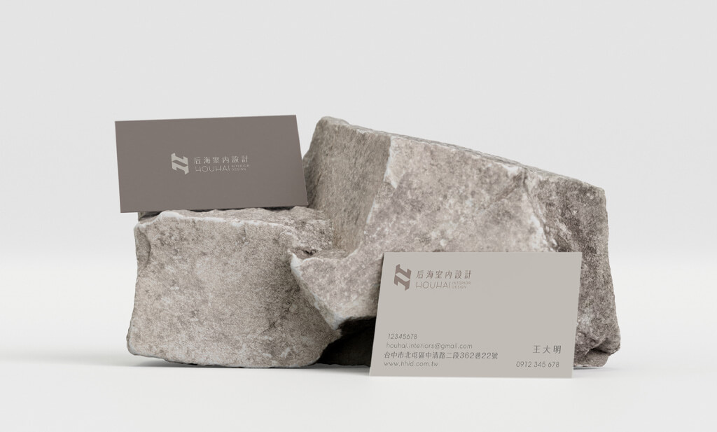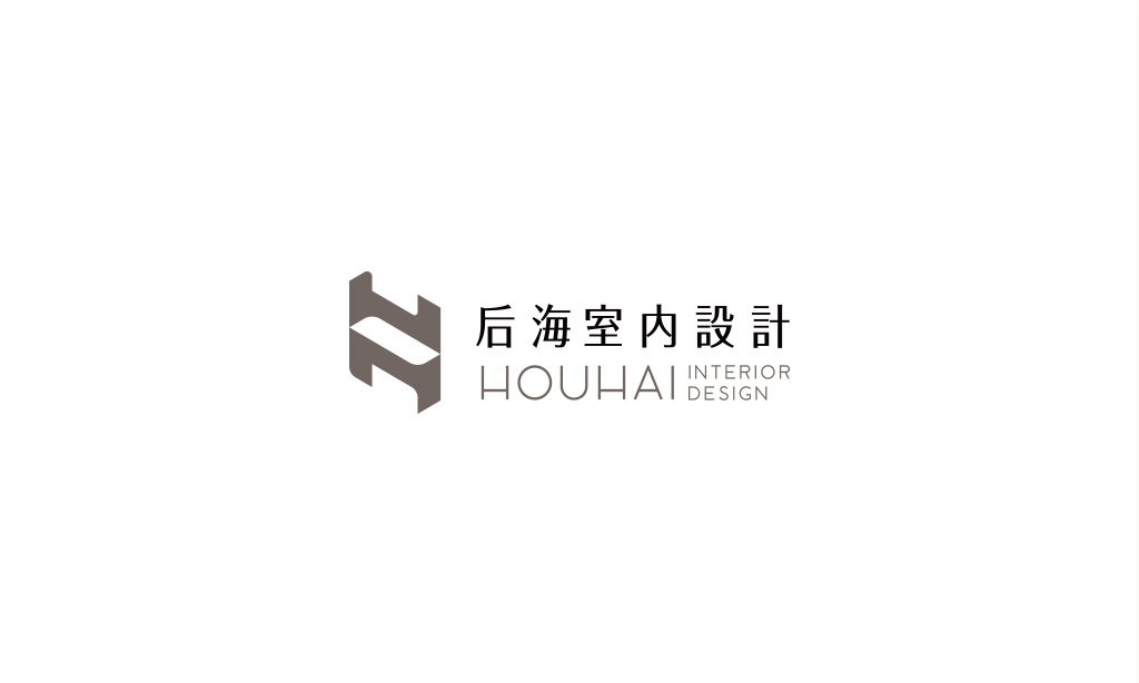 標誌巧妙結合英文字母「H」,連結HOU HAI 與 HOME。家是堅強的後盾,支柱般的造型傳達出后海透過匠心思維築出每個人的依靠;錯視感中體現兩位設計師的協手合作。為了更加直觀呈現行業的空間概念,採用簡約俐落的3D切割,整體設計更具現代風格。色彩上則選擇灰橡色,將深色系的從容優雅表露無遺,溫暖的木質感則散發細膩,讓人在后海所設計的空間裡,感到舒服且安心。